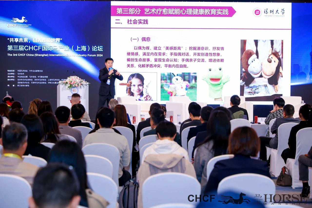 在第三届 CHCF 国际马产业(上海)论坛中,深圳大学艺术学部艺术疗愈中心主任王维斌先生以正在深圳大学实践的《实验心理剧》为例,从一位教育者的角度,充满激情地描述了最新的艺术教育与艺术疗法的诞生是源自于技术性、审美性和形式性的三者合一,而马术运动同样具备独特的艺术性,和独有的技术性,可以很好地应对当下青少年的亚健康心理状态。