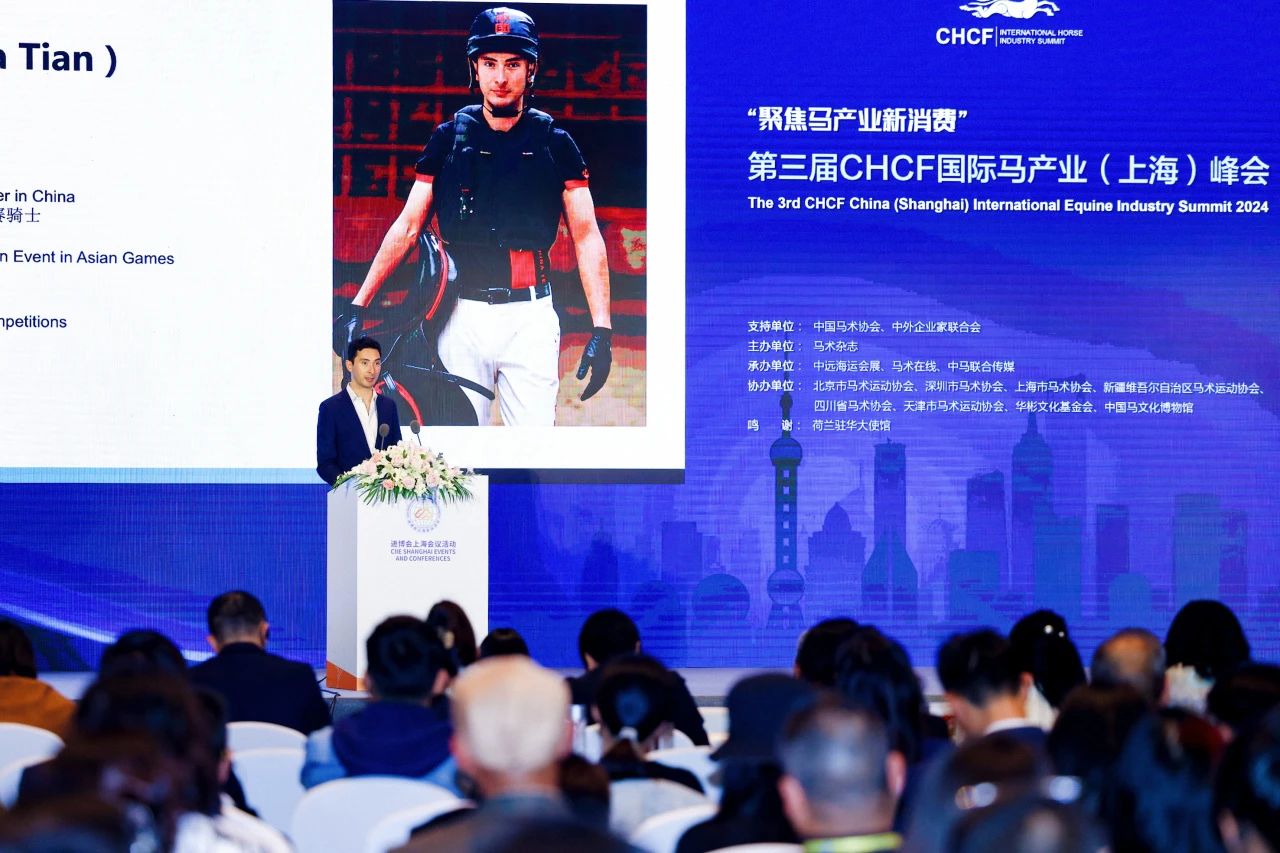 中国奥运马术三项赛骑士华天在第三届CHCF国际马产业(上海)峰会上做主题演讲