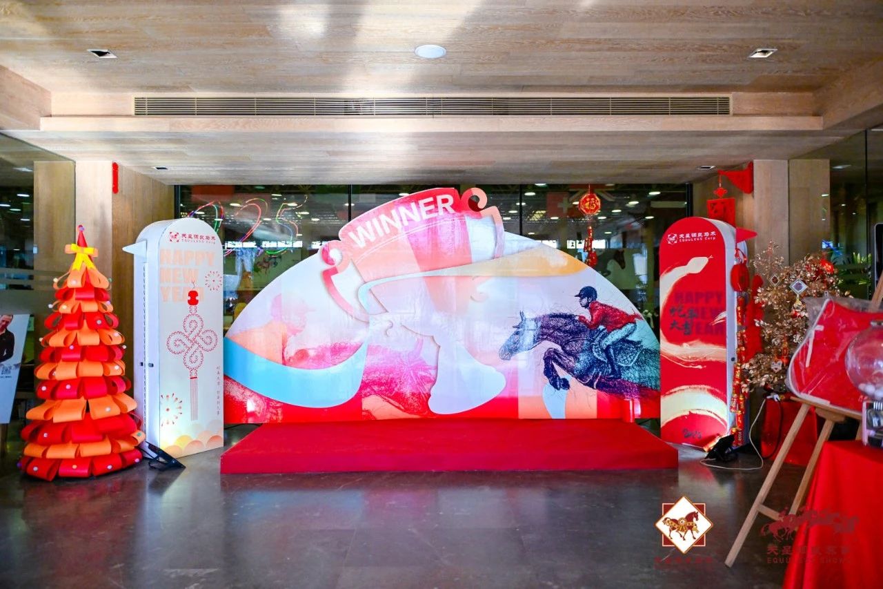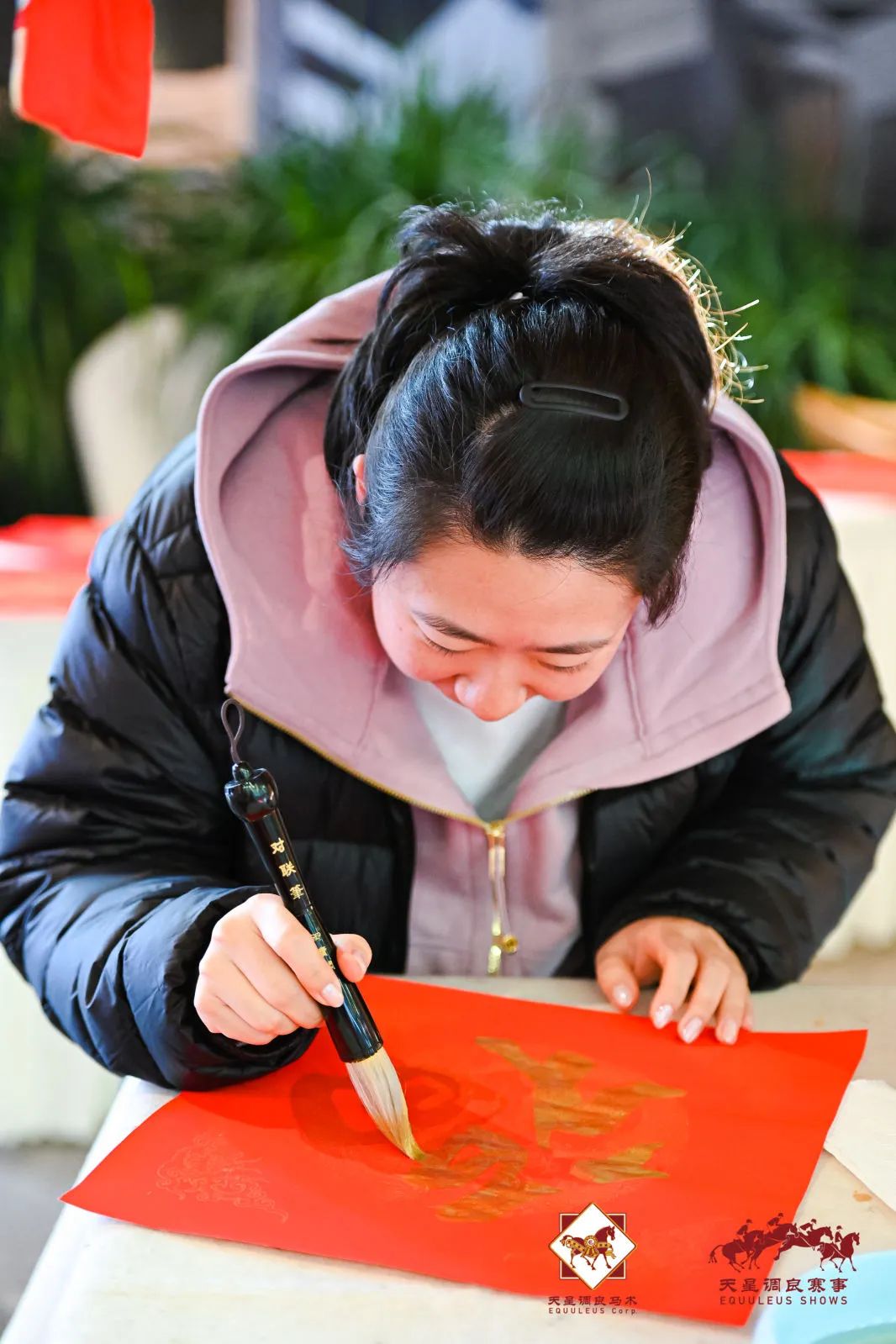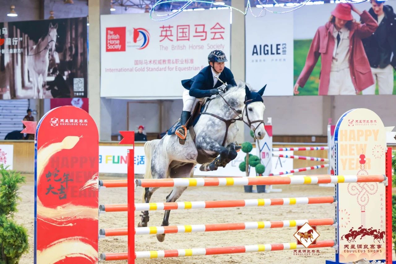 这场比赛作为天星调良马术在2024年和2025年之交举办的赛事,充满了“年味”。场地中心上方悬挂着“2025”的彩灯装饰,映射出所有马术人对新的一年的期待。中国结障碍、“蛇年大吉”障碍预示着农历新年的到来,让整场比赛充满了节日氛围。
