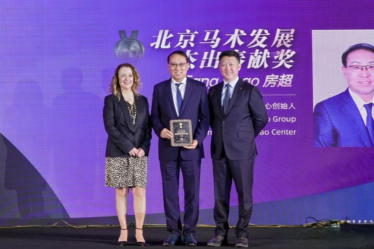 北京市马术运动协会**刘诗来先生(右)国际马联秘书长萨布丽娜·伊巴涅斯女士(左)为房超先生(中)颁发“杰出贡献奖”