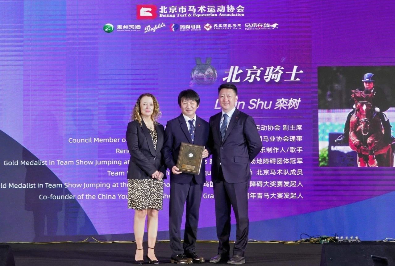 北京市马术运动协会**刘诗来先生(右)国际马联秘书长萨布丽娜·伊巴涅斯女士(左)为栾树先生(中)颁发“北京骑士奖”