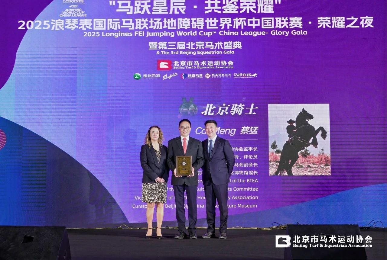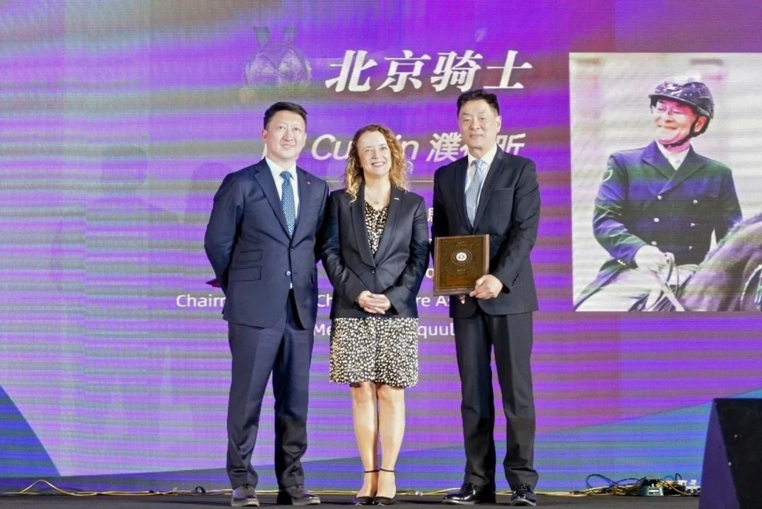 北京市马术运动协会**刘诗来先生(右)国际马联秘书长萨布丽娜·伊巴涅斯女士(左)为蔡猛先生(中)颁发“北京骑士奖”