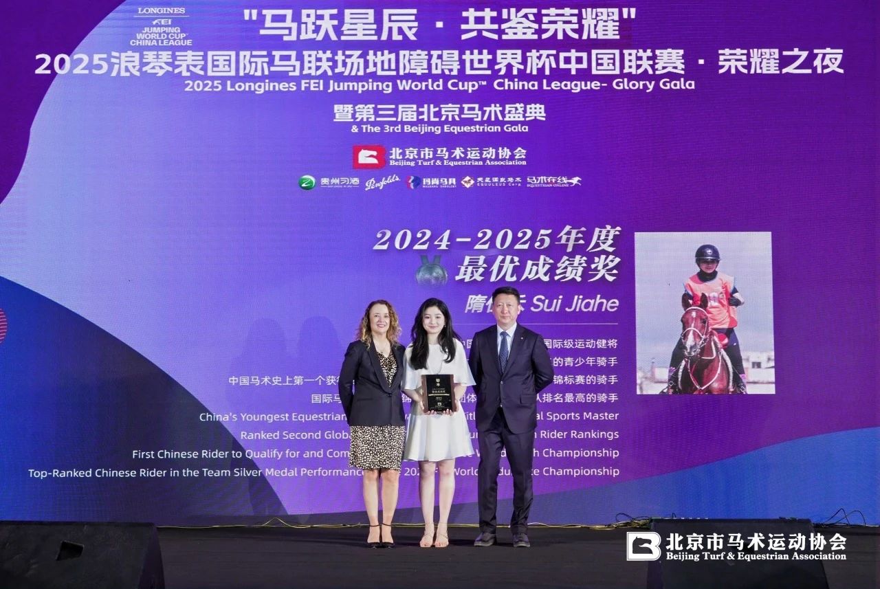 北京市马术运动协会**刘诗来先生(右)国际马联秘书长萨布丽娜·伊巴涅斯女士(左)为隋佳禾女士(中)颁发“2024-2025年度最优成绩奖”