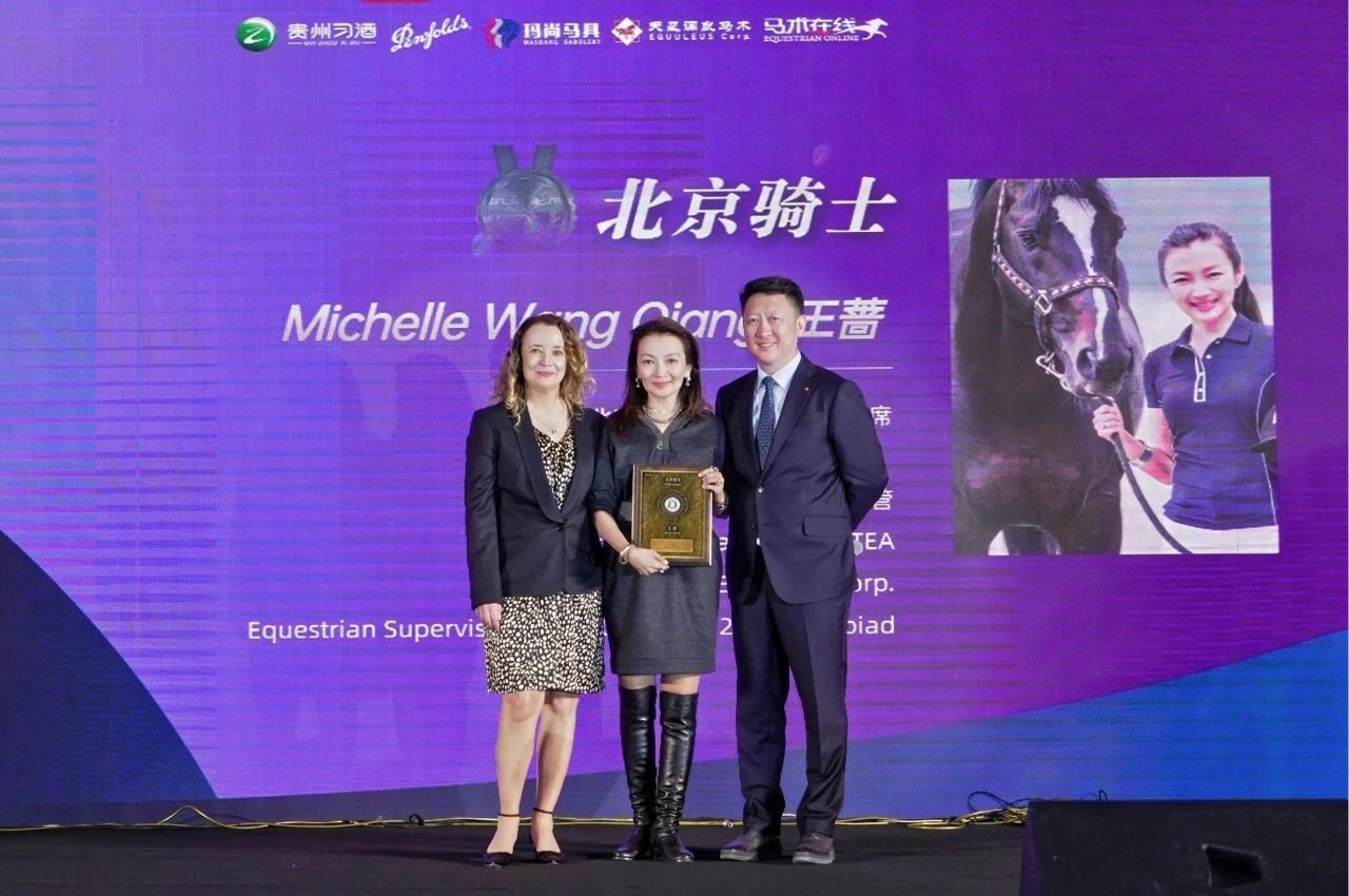 北京市马术运动协会**刘诗来先生(右)国际马联秘书长萨布丽娜·伊巴涅斯女士(左)为王蔷女士(中)颁发“北京骑士奖”