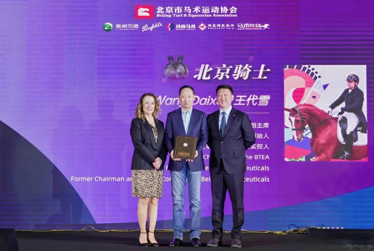 北京市马术运动协会**刘诗来先生(右)国际马联秘书长萨布丽娜·伊巴涅斯女士(左)为王代雪先生(中)颁发“北京骑士奖”