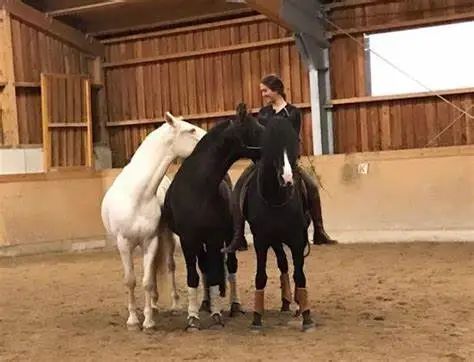 三匹马一起做一些联合的马术技巧(如西班牙步同步进行)也能非常有趣!实际上,你的想象力没有界限,无论如何,希望你和你的两匹马能在训练的起步阶段就享受许多乐趣!