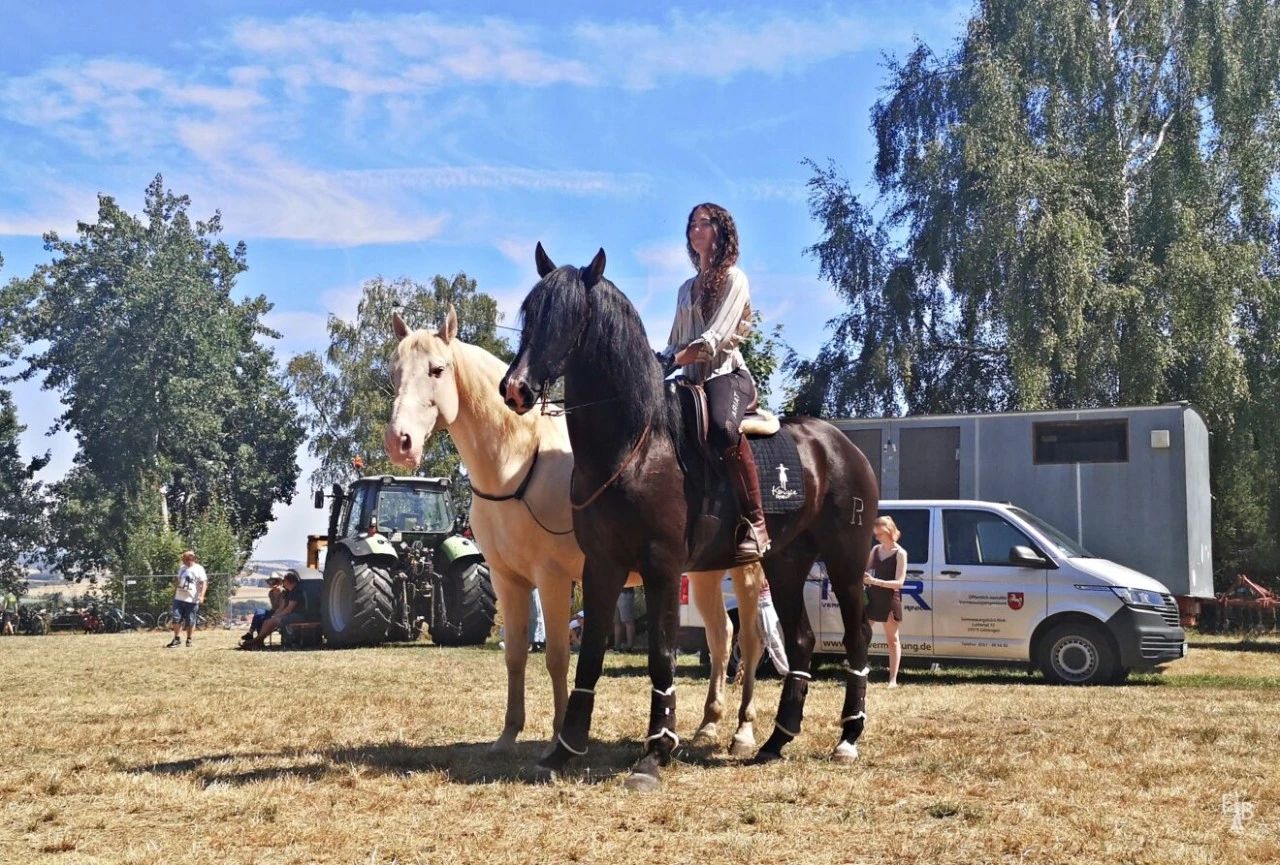 要与两匹马一起训练,它们当然都应该已经各自学会了自由训练的各种基本要素。每匹马都有自己的天赋,并非每个练习都适合所有马。但“引导练习”的基础和反射点应该已经能够在自由状态下很好地执行。