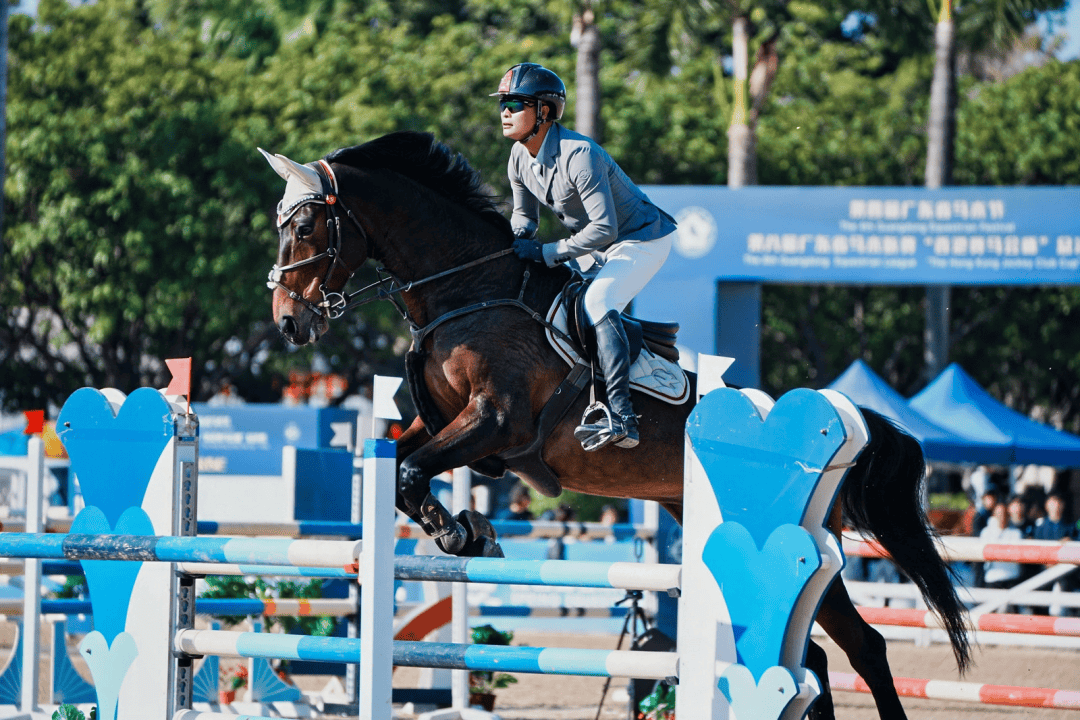 图:奥运骑手、十五运会双冠军骑手梁锐基在第八届广东省马术联赛总决赛比赛现场