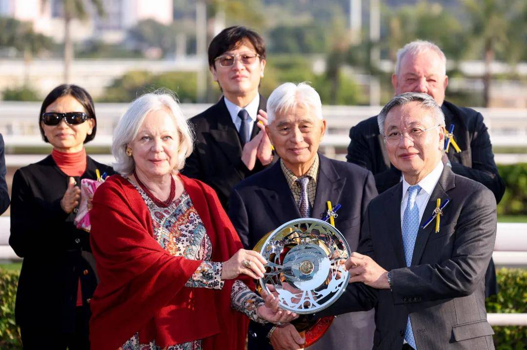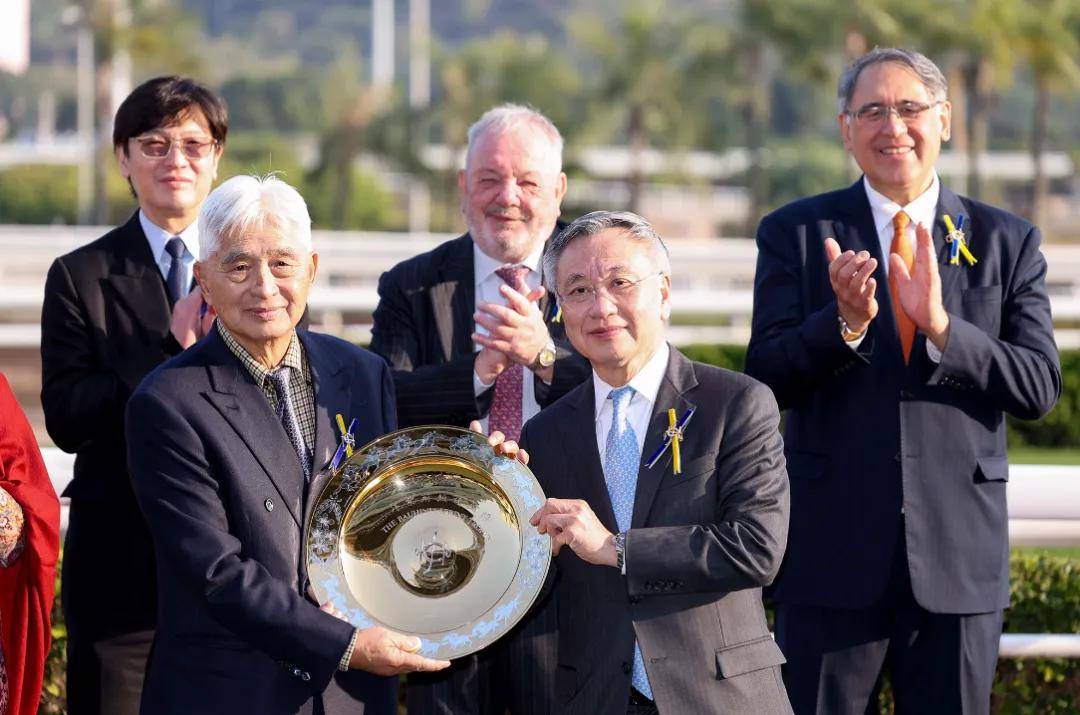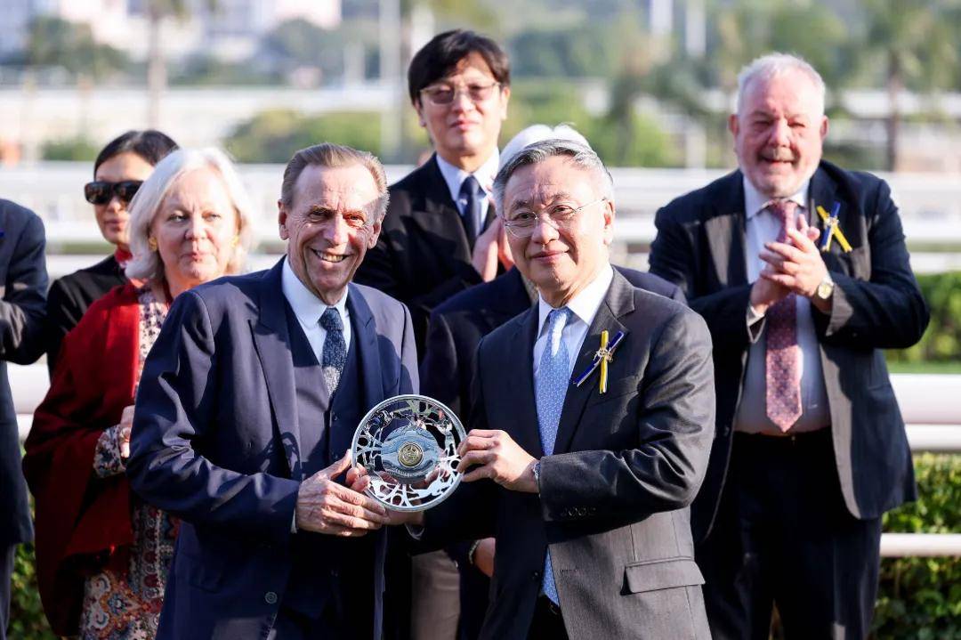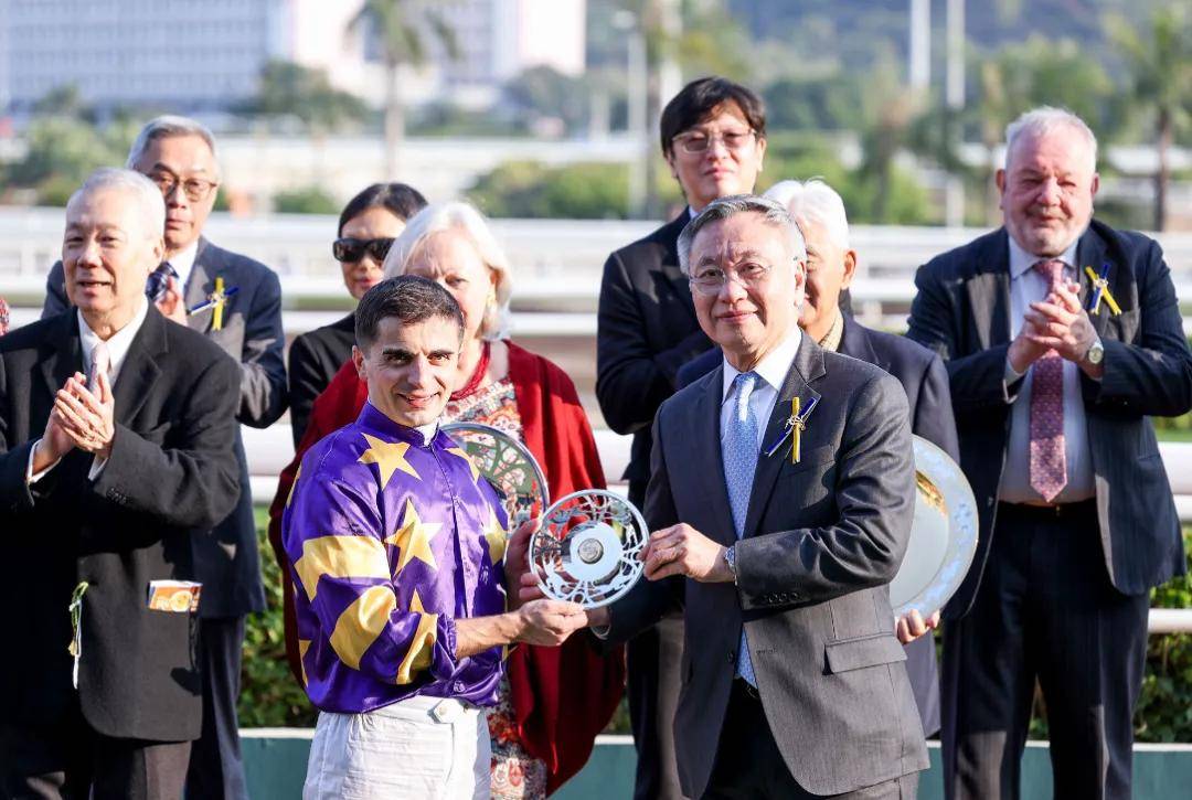 香港赛马会董事罗启华颁发奖杯及银碟予头马“星际快车”的马主荣智健及其代表、以及银碟予胜出练马师蔡约翰及胜出骑师艾兆礼。