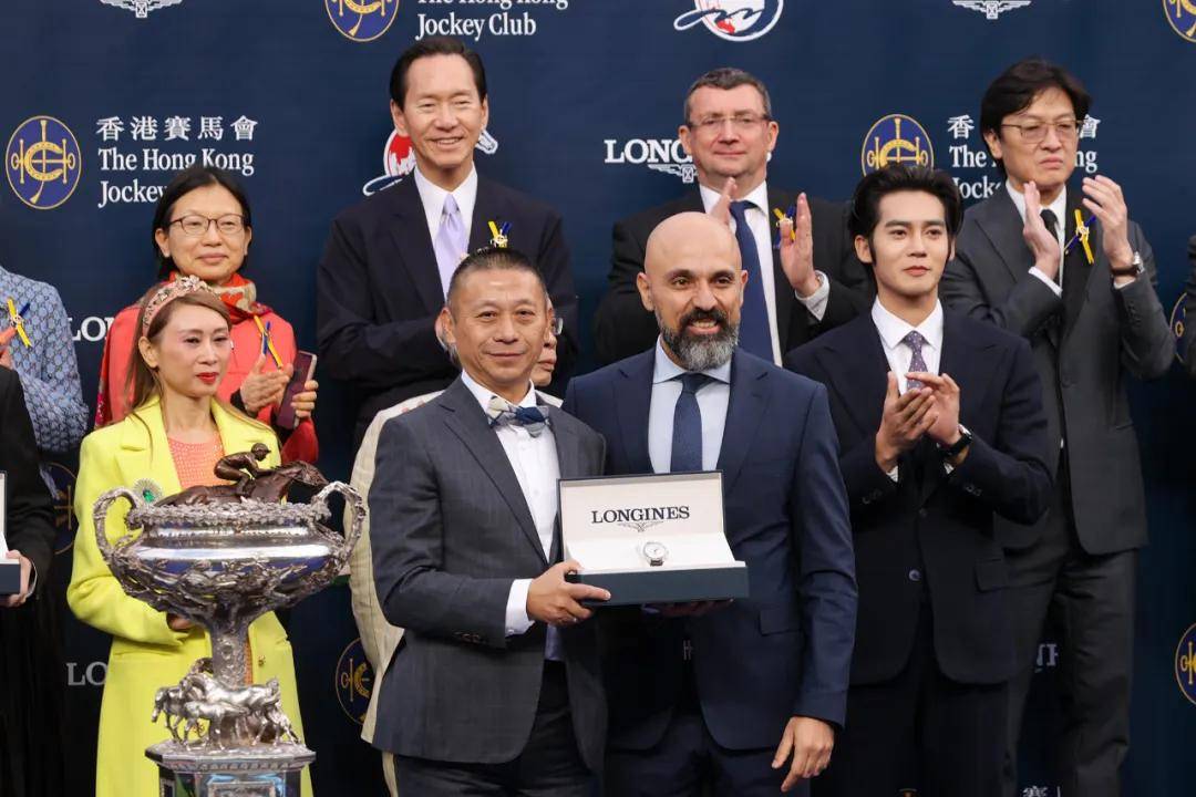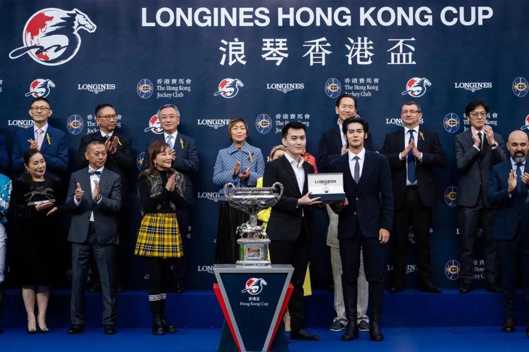 香港杯颁奖仪式上,浪琴优雅大使于适(一排、右)致送浪琴名匠系列计时腕表予“浪漫勇士”的马主代表(一排、左)。 图片来自HKJC