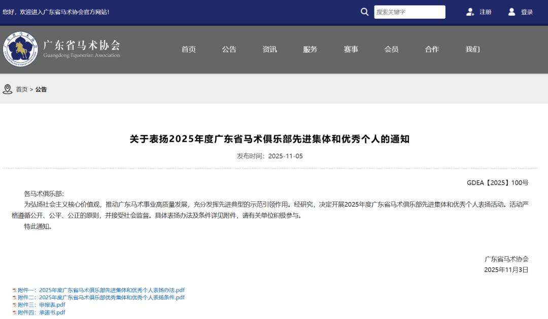 马文化艺术获悉 近日,广东省马术协会官网发布《关于表扬2025年度广东省马术俱乐部先进集体和优秀个人的通知》,据通知所示,为弘扬社会主义核心价值观,推动广东马术事业高质量发展,充分发挥先进典型的示范引领作用。经研究,决定开展2025年度广东省马术俱乐部先进集体和优秀个人表扬活动。