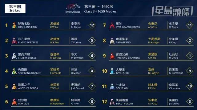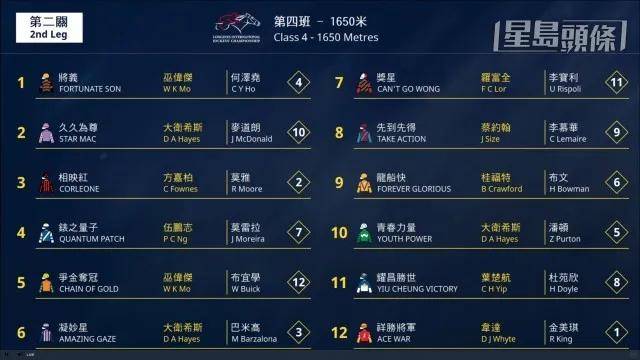 此外,今年参赛的骑师还包括布文、杜苑欣、何泽尧、金美琪、莫雷拉、李慕华及李宝利,无一不是国际马坛的顶尖好手。