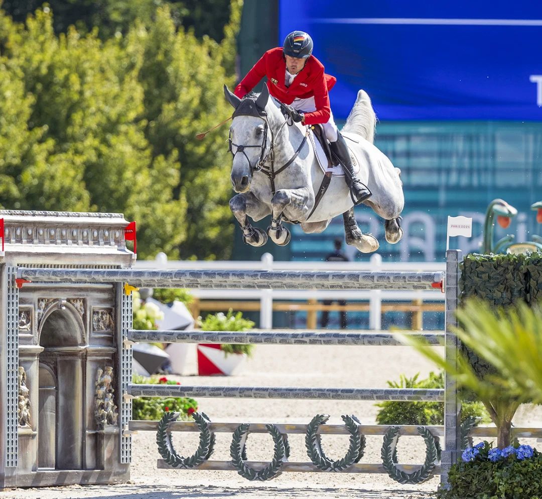 2024巴黎奥运会,正从一道极具法国特色障碍上跳过的克里斯蒂安·库库卡(Christian Kukuk)与“Checker 47”