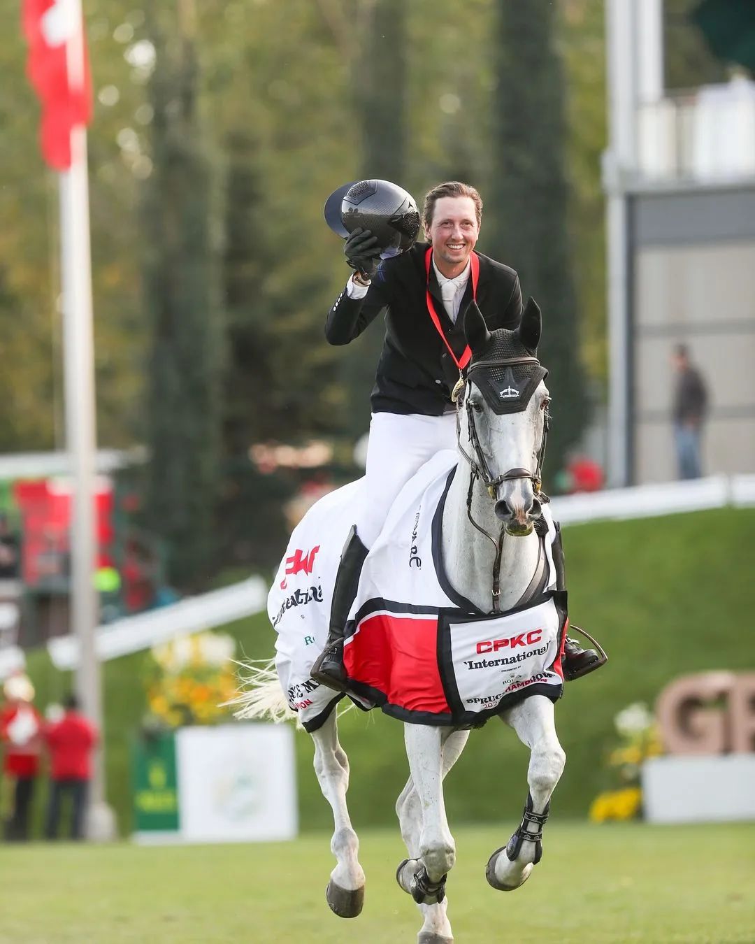 加拿大卡尔加里当地时间9月8日下午两点,劳力士呈献CPKC国际大奖赛准时开始。当地气温是30度,对于地处北纬51度的卡尔加里来说,算是非常热了。但是,云杉草地的国际赛场(International Ring)旁依旧坐满了人,就连场地西侧的德比坡的草地上也坐着观众。