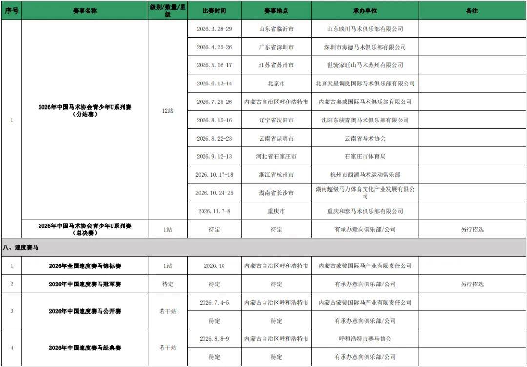 目前,2026年中国速度赛马冠军赛、中国速度赛马经典赛的具体举办场次、时间及承办单位等事项仍在规划中,有待进一步确定。