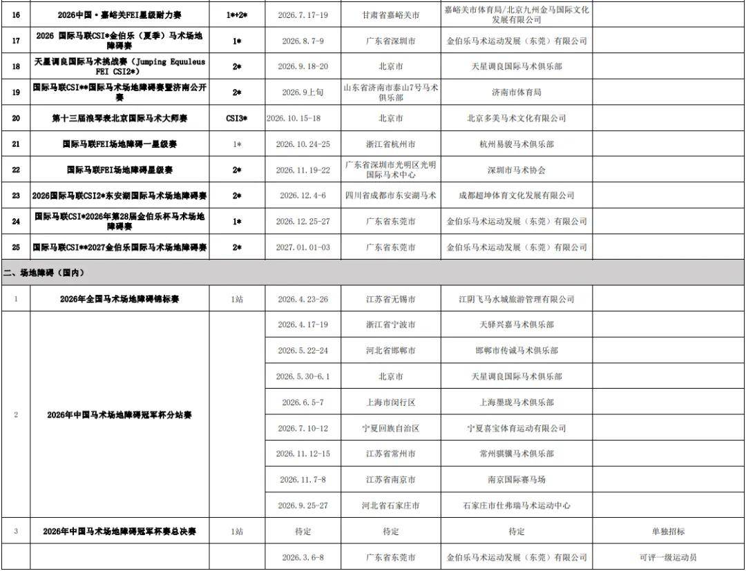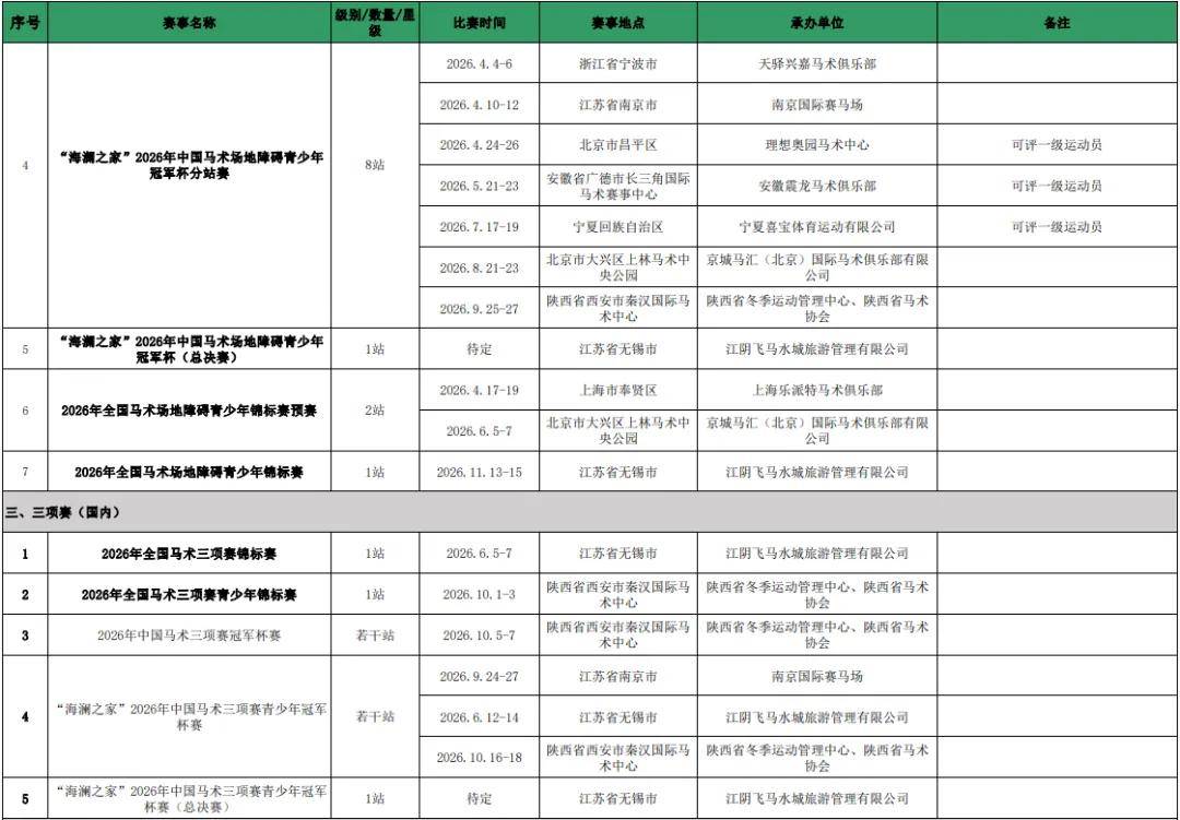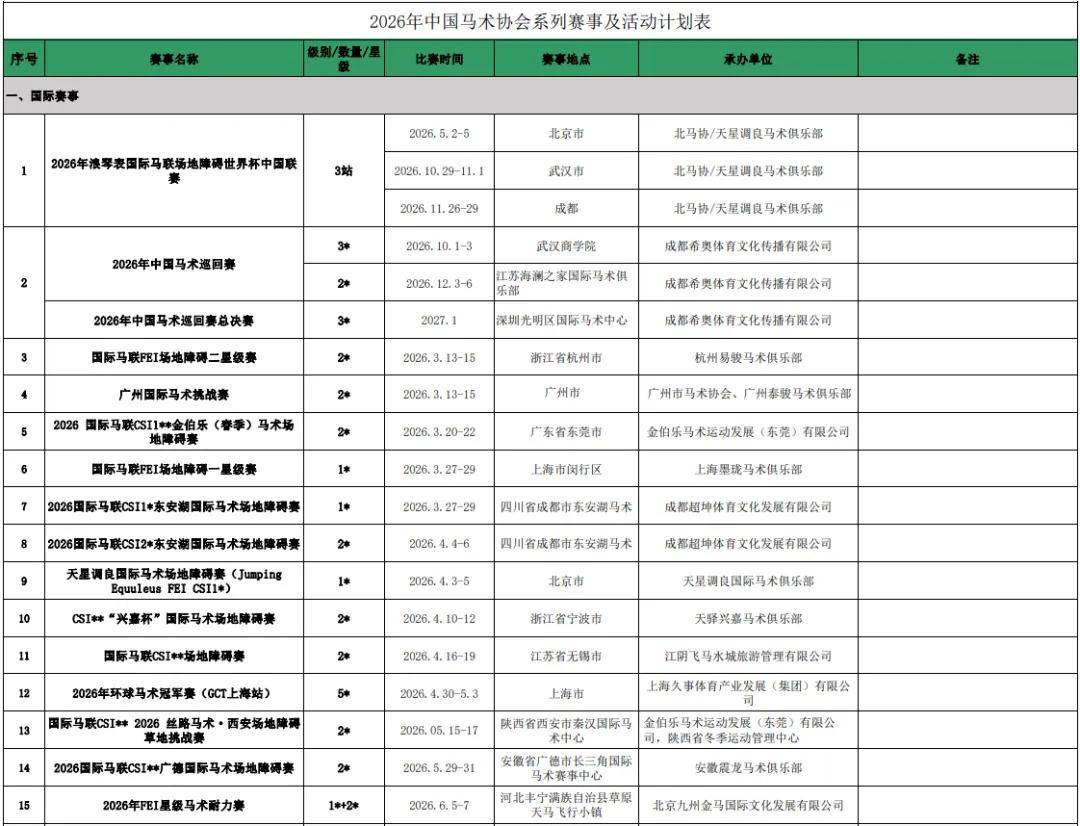 马文化艺术了解到,中国马术协会本次公布了国际马术赛事、国内马术场地障碍、国内三项赛、国内盛装舞步、国内耐力赛、马球、U系列比赛以及速度赛马赛事的承办单位。