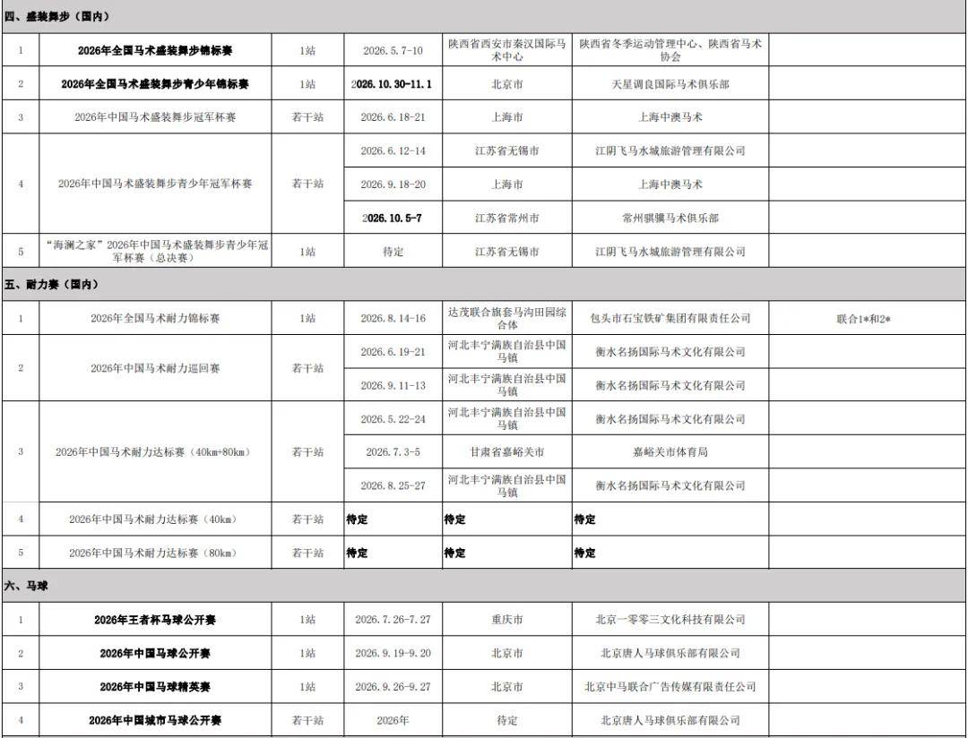近日(1月13日),中马协在其官网及微信公众号正式公布2026年中国马术协会系列赛事及活动的相关承办单位名单。公示期为5个工作日,公示截止日期为2026年1月20日。在公示期结束后30个工作日内,中国马术协会将和所有承办单位与正式签署赛事合作协议(所有承办单位必须是中马协团体会员)。延期签署视为赛事承办单位自动放弃承办该项赛事。