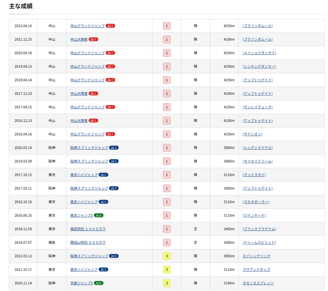 石神深一表示长山之马既不听话还很吵闹,如同任性的小孩子一般,感觉很棘手。虽然很有潜力,但是被其性格限制无法百分百发挥出来。石神深一与长山之**第一次配合是在2015年的东京跳跃锦标赛(東京ジャンプステークス,J·GIII),当时虽然只跑到了第四名但是石神深一感觉到长山之马连一半的力都没出,当即对其如果出了百分百的力能跑到什么程度燃起了浓烈的兴趣。在与长山之马相遇一年后,2016年4月16日,长山之马第一次取得了障碍赛的G1,从此开启了王者征程,创下了历史最高的障碍重赏九连胜,长山之马开始被人们称为绝对王者。同时因为其压倒性的强大,长山之**人气也稳步上升,赛马粉们被长山之马遭受过接连挫败,却再一次回到赛场的经历所感动。随着人气的上升,长山之马不仅有周边贩售,而且还拥有专门的摊位,这对于障碍赛马来说是非常特别的。