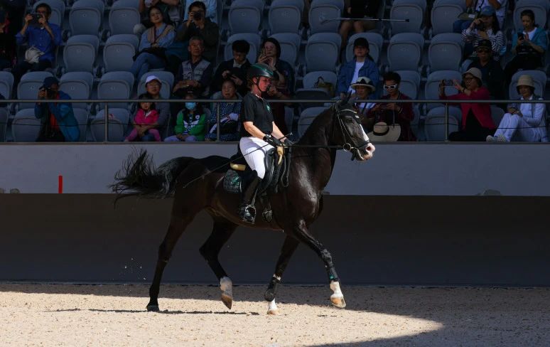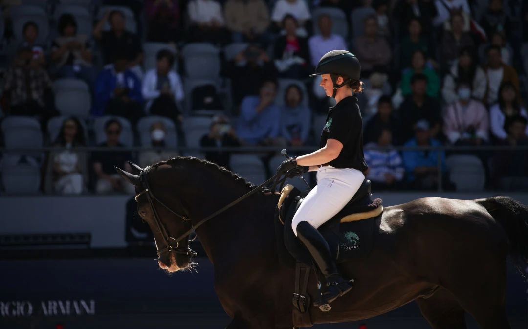 在10月3日的舞步大师表演中,来自爱尔兰的盛装舞步女王朱蒂·雷诺兹策马跃动在赛场中央,通过流畅的步伐,柔和且默契的人马动作,伴着阳光照耀的婀娜身影,给现场所有人呈现出一场充满艺术性的表演。