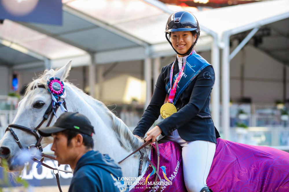 下午14:00,首场115CM挑战赛(第1场)共迎来46对人马组合参与冠军角逐。来自京格尔嘉豪马术的孙瑞睿策骑“大 BLUE”第34个出场,一人一马在一轮流畅自如、行如流水的行进中,最终以0罚分、57.41秒的行进时间极速登顶!并将领先优势一直保持到比赛结束,成功将第十一届浪琴表北京国际马术大师赛的第一个冠军收入囊中。亚军则由张偌瑶和“赤燕”这对搭档斩获;来自海外骑际马术的卢墨涵与“墨舞绝尘”则以不俗的表现,最终凭借着0罚分、60.31秒的行进时间获得季军。