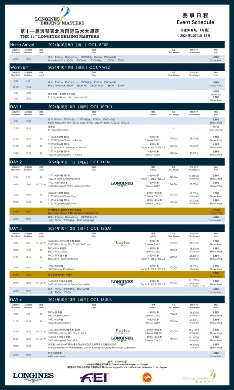 今年的大师赛在项目设置方面更加全面精细,包括了80CM U14新星赛和团体赛、9OCM新秀赛、105CM公开赛和团体赛、115CM挑战赛 、125CM冠军赛和团体赛、135CM EuroHorse精英赛、150CM浪琴表大奖赛等多个级别。级别设置丰富,总奖金更是超200万元,总奖金更是超200万元,充分彰显了赛事的规格与影响力。