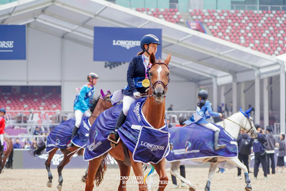 收官日的首场赛事是90CM新秀赛,本场比赛共有50对人马组合参赛,采用一轮争时赛赛制。来自北京国发马术的高梓涵,策骑 “黑喜悦” 第23位出场,一轮快速稳定的行进后,以0罚分、45.91秒的出色成绩完赛,成功刷新了最佳时间,并将领先优势一直保持到全场比赛结束,成功斩获冠军!前田华莲与搭档“秋”以微弱的劣势摘得亚军,季军则由来自京格尔嘉豪马术的田纳菲和搭档“小双”以0罚分、行进时间46.37秒的成绩摘得。