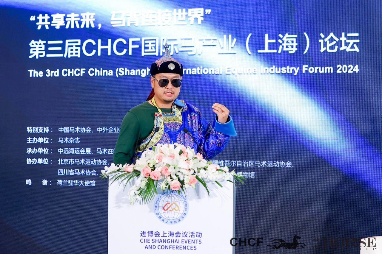来自我国文旅产业,西拉木伦河畔马场马术旅游的创始人郑一丹先生,身披蒙古袍发表了主题为“马术旅游对都市人的疗愈”的演讲,分析了我国马背旅游的行业现状,并分享了一个成熟的马背旅行产品所需要具备的要素条件。