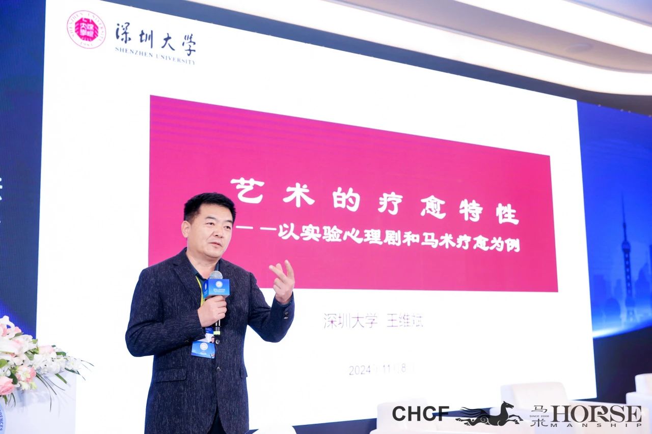深圳大学艺术学部艺术疗愈中心主任王维斌先生肯定了贾伟先生的观点,并进一步以深圳大学正在实践的实验心理剧为例,从一位教育者的角度,充满激情地描述了最新的艺术教育与艺术疗法的诞生是源自于技术性、审美性和形式性的三者合一,而马术运动同样具备独特的艺术性,和独有的技术性,是心理、德育、美育、思政教育有机结合下的心得心理防御样态,可以很好地应对当下青少年的亚健康心理状态。