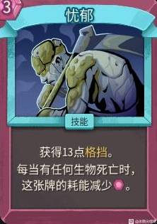 首先是忧郁,这张牌可以说是碎骨的好兄弟,也是小手物理流最常用的防御过渡乃至终端。忧郁敲后防17,除去面对道中群怪时的降费优势,碎骨主动爆掉小手降费也是一个非常高效的手段。3费环境下,配合碎骨小手一次爆掉也能一回合起最高12+17=29点甲,长线对单boss战打两轮忧郁就能0费防17,只要保证抓灵魂运转,后面完全可以单忧郁起防cos散装储君粒子墙,后者刚需蓝星,而忧郁只需要有部分灵魂循环组件,一轮就能叠到足够吃下3层boss每轮输出的甲,并且给到高费榨取之类的输出机会。